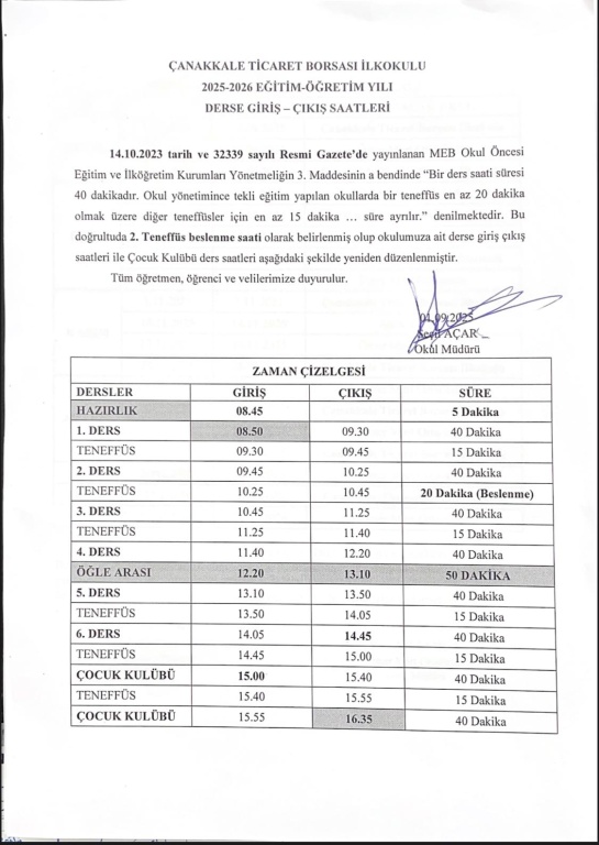 2025-2026 EĞİTİM ÖĞRETİM YILI DERS GİRİŞ VE ÇIKIŞ SAATLERİMİZ (Güncellendi 05.09.2025)